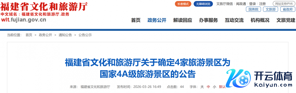 依照中华东说念主民共和国国度设施《旅游景区质料等第隔离》和《福建省旅游景区质料等第惩办观点》,经关连市级文化和旅游行政部门保举,福建省文化和旅游厅按方法组织评定并于2026年3月23日完成公示,细目以下4家旅游景区为国度4A级旅游景区。名单如下: