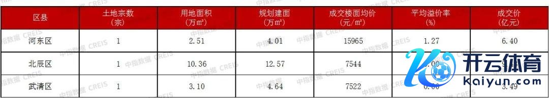 2024年11月天津成交3宗涉宅用地,经兴建面共21.22万㎡,成交价共19.37亿元,平均溢价率0.41%。成交地块为津东卫(挂)2024-31号地块、津武(挂)2024-013号地块、津北辰朝(挂)2024-29号。